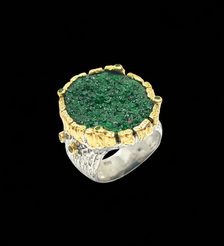 Ein absolutes Unikat für Sammler und Liebhaber seltener Edelsteine! Dieser extravagante Ring vereint die leuchtende Kraft von zwei aussergewöhnlichen grünen Schönheiten: