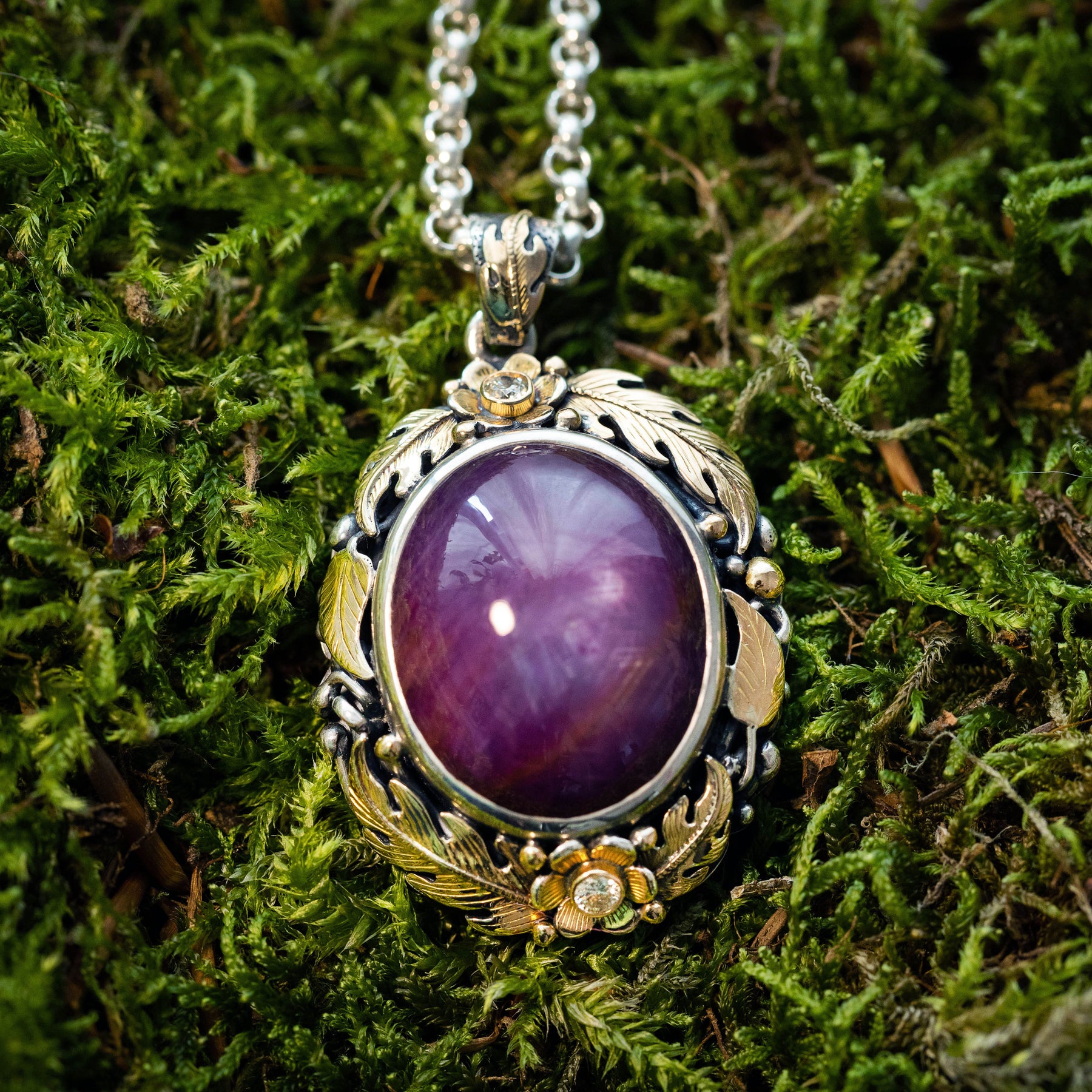 Ein handgefertigter Anhänger aus Sternrubin, kunstvoll eingefasst in eine Mischung aus Gold und Silber und akzentuiert mit funkelnden Brillanten. Dieses Schmuckstück vereint die strahlende Schönheit des Sternrubins mit dem zeitlosen Glanz der Diamanten. Jeder Anhänger ist ein Unikat, von Hand gefertigt, und strahlt eine Aura von Eleganz und Raffinesse aus. Ein Ausdruck von Luxus und Stil, der die Blicke auf sich zieht und das Herz jeder Trägerin höherschlagen lässt.