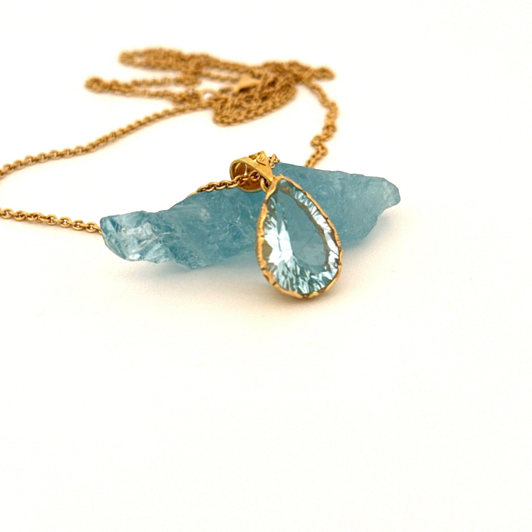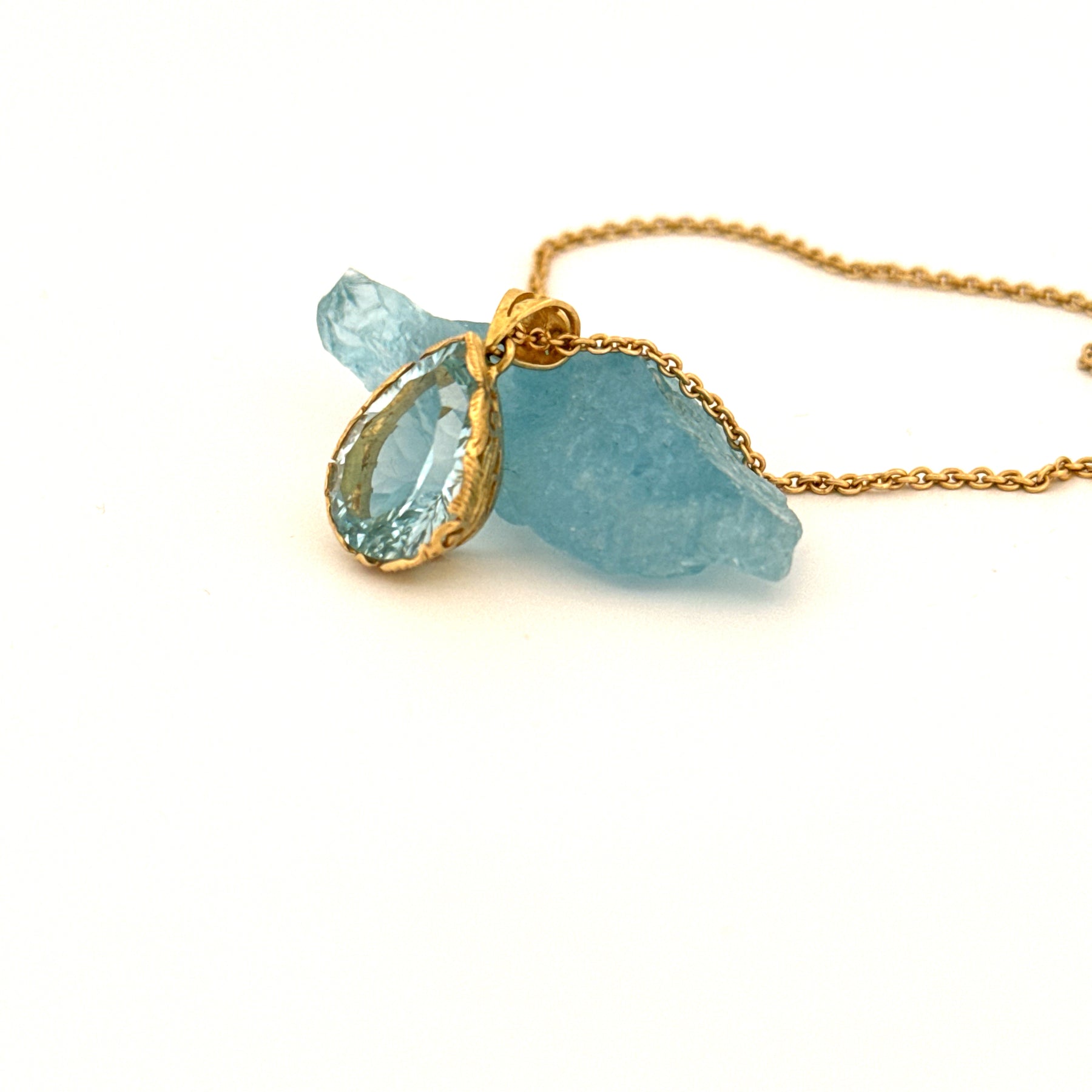 An 18-carat gold pendant, artfully sculpted by skilled hands, encapsulates the magic of the sea. An aquamarine, gently shimmering like the deepest body of water, rests embedded in this creation. Every brushstroke of goldsmith's art tells a story of elegance and dedication, a piece of jewelry that touches the soul and enchants the mind. Wear it and let the splendor of the ocean sparkle on your heart.